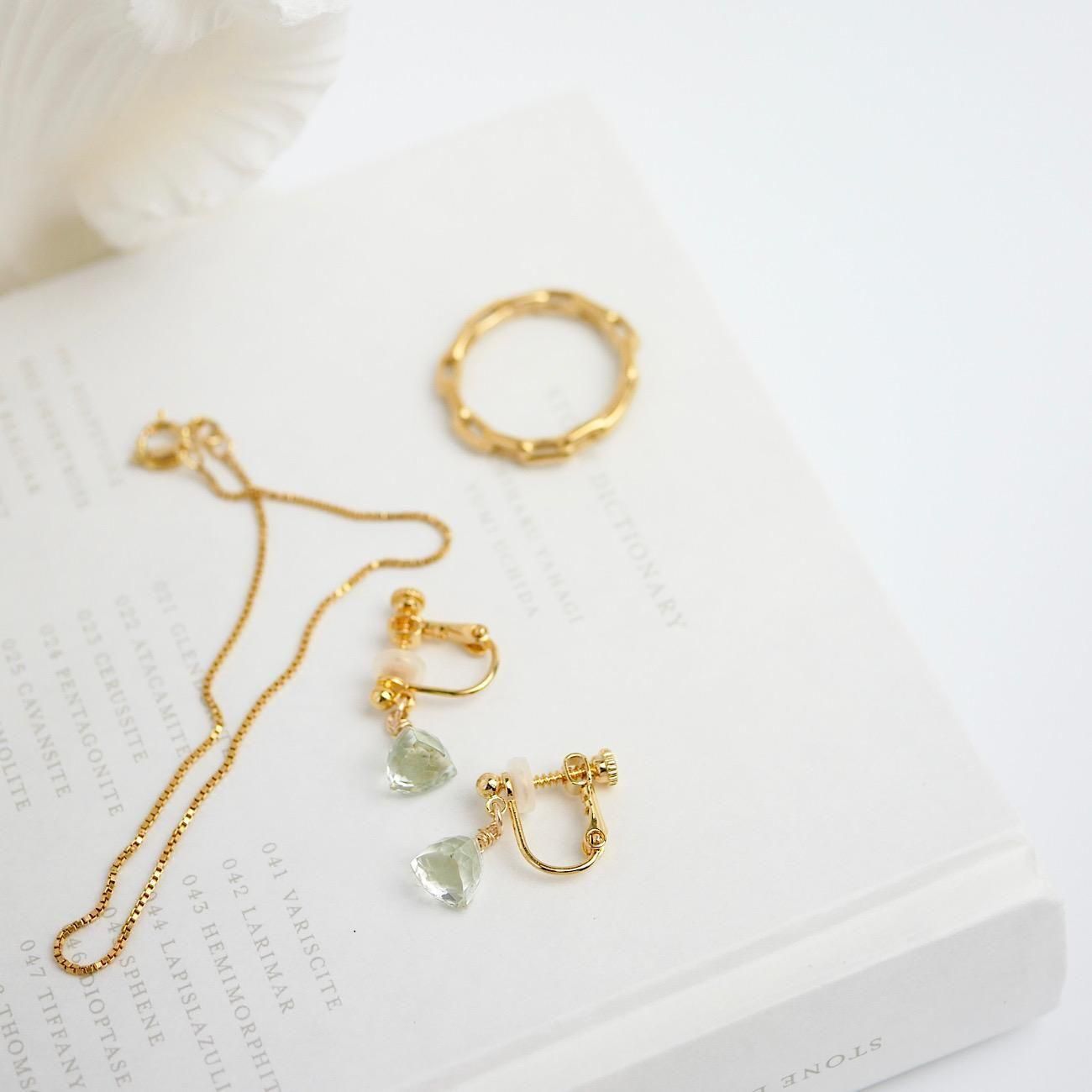 6,600円(税込)人気石のグリーンアメジスト。クリアに近い優しいグリーンカラーで春夏の耳元も華やかに。 -