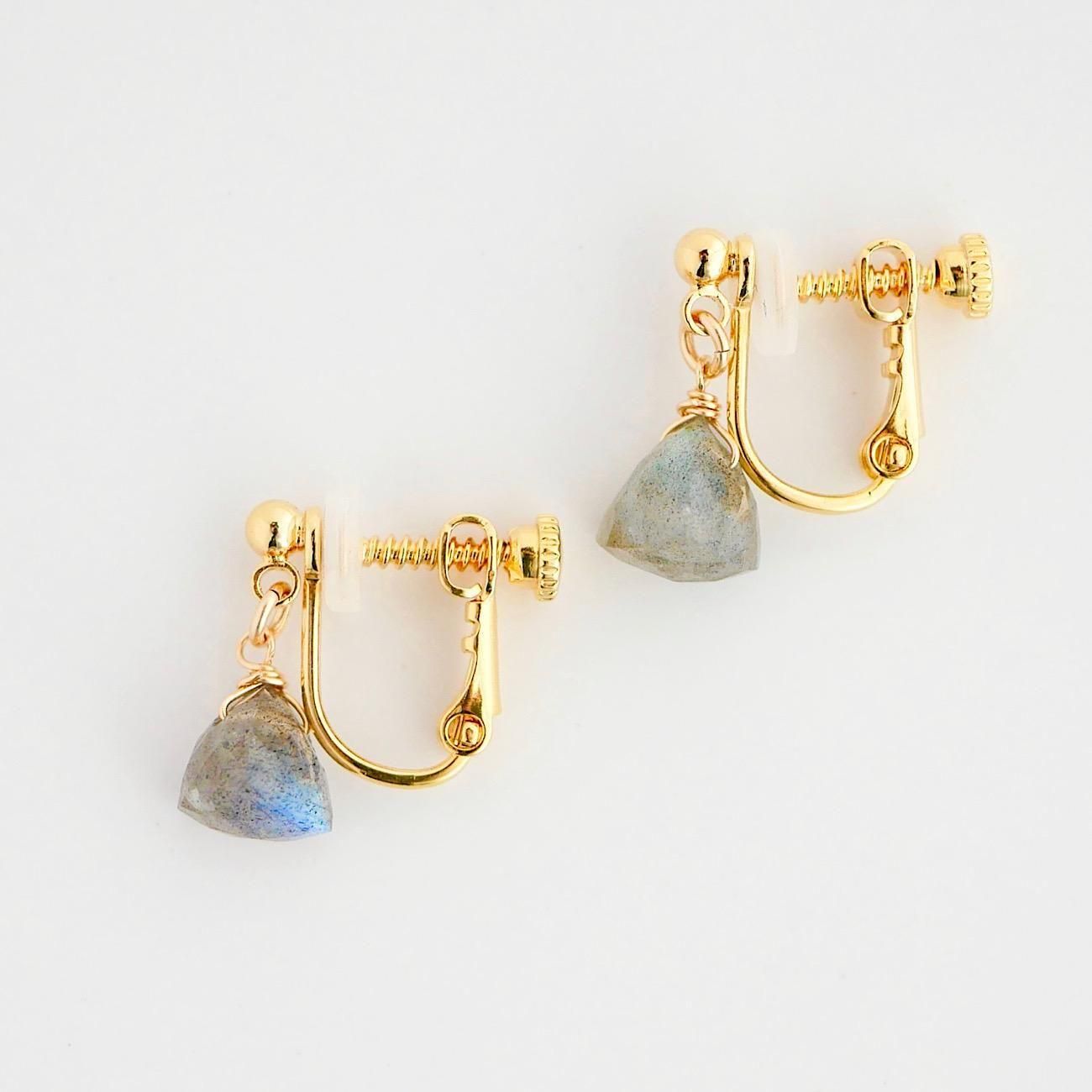 珍しいピラミッド型の天然石ラブラドライトでイヤリングを作りました。虹色のような綺麗なシラーが特徴です。
